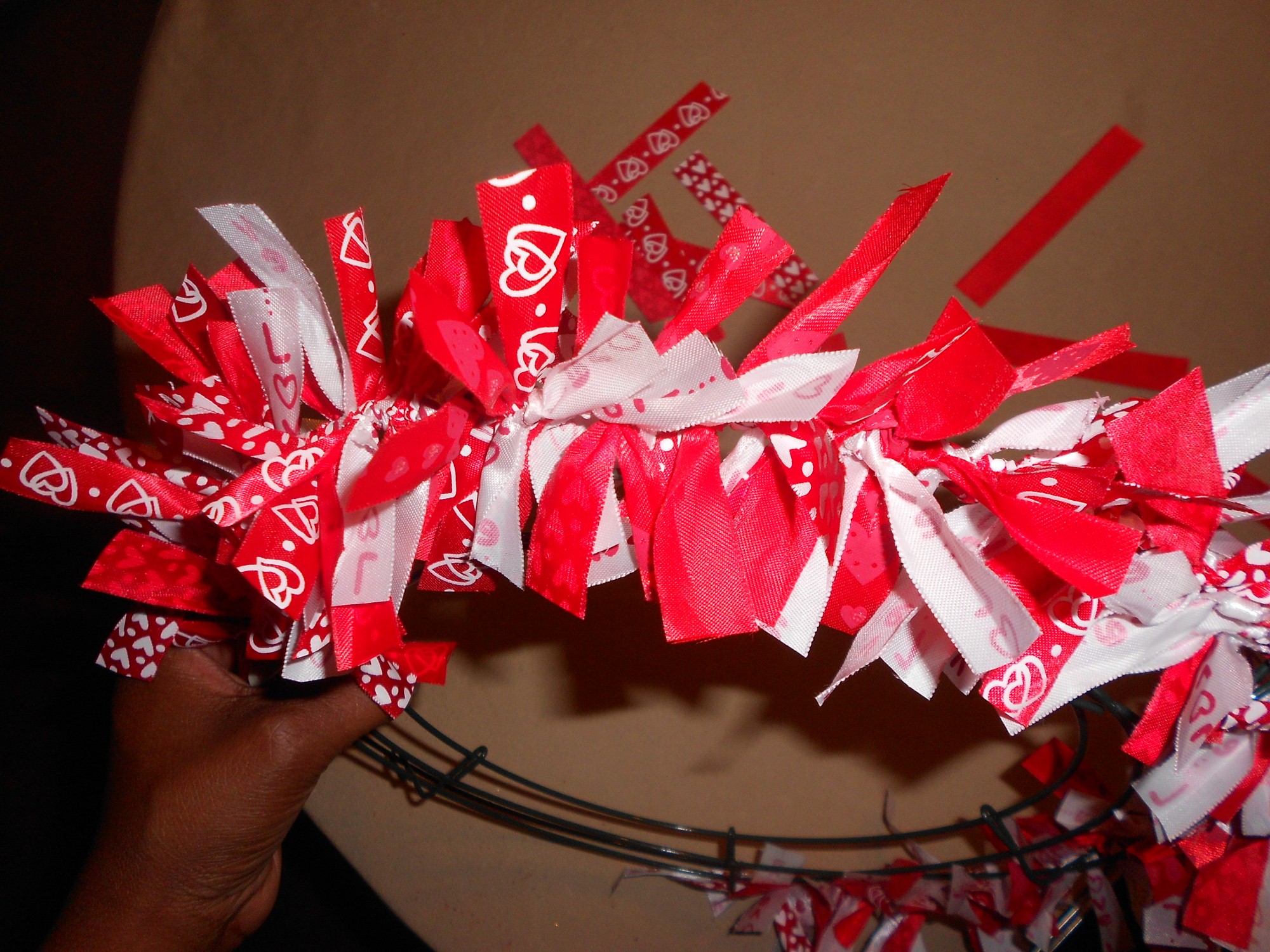 First, I cut several pieces of the ribbon into about 4 to 5 in. long strips. Then I tied the ribbon strips into double knots around the top and third rings of the wire wreath.