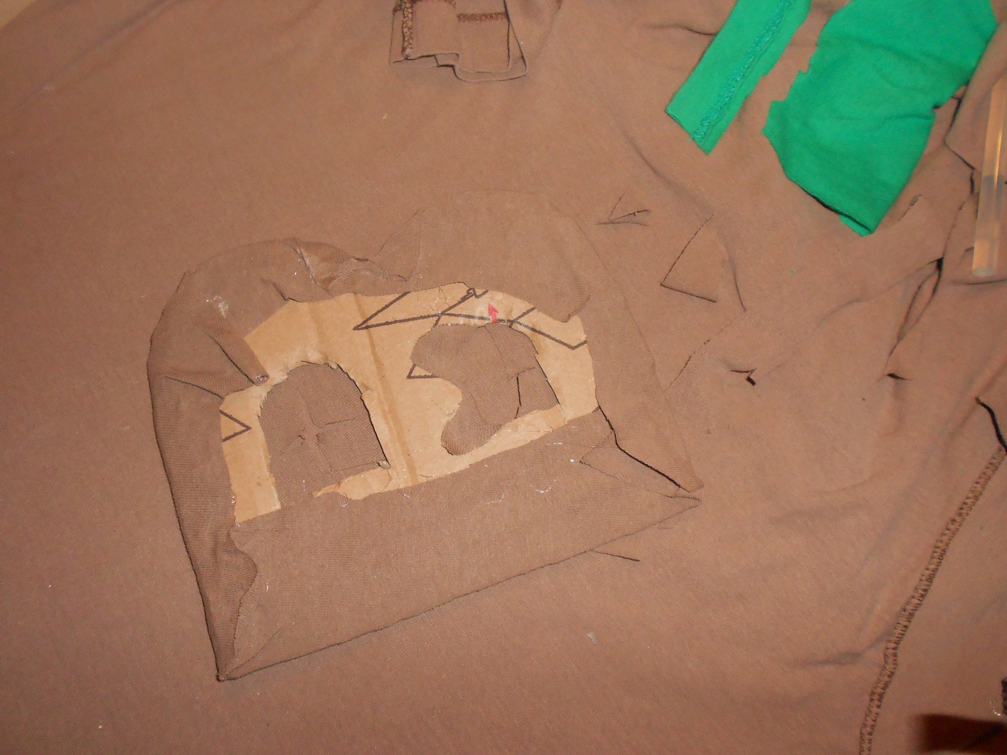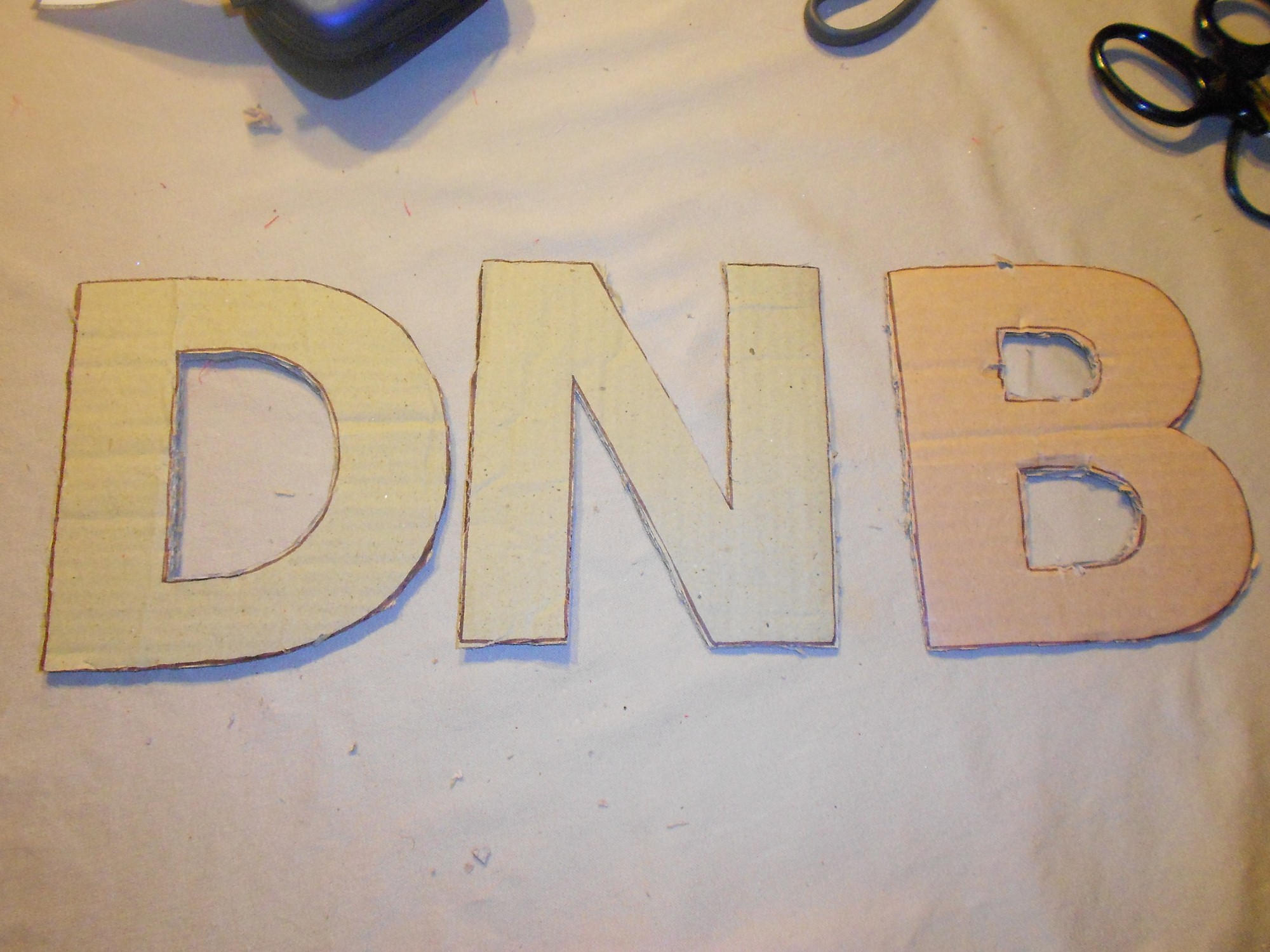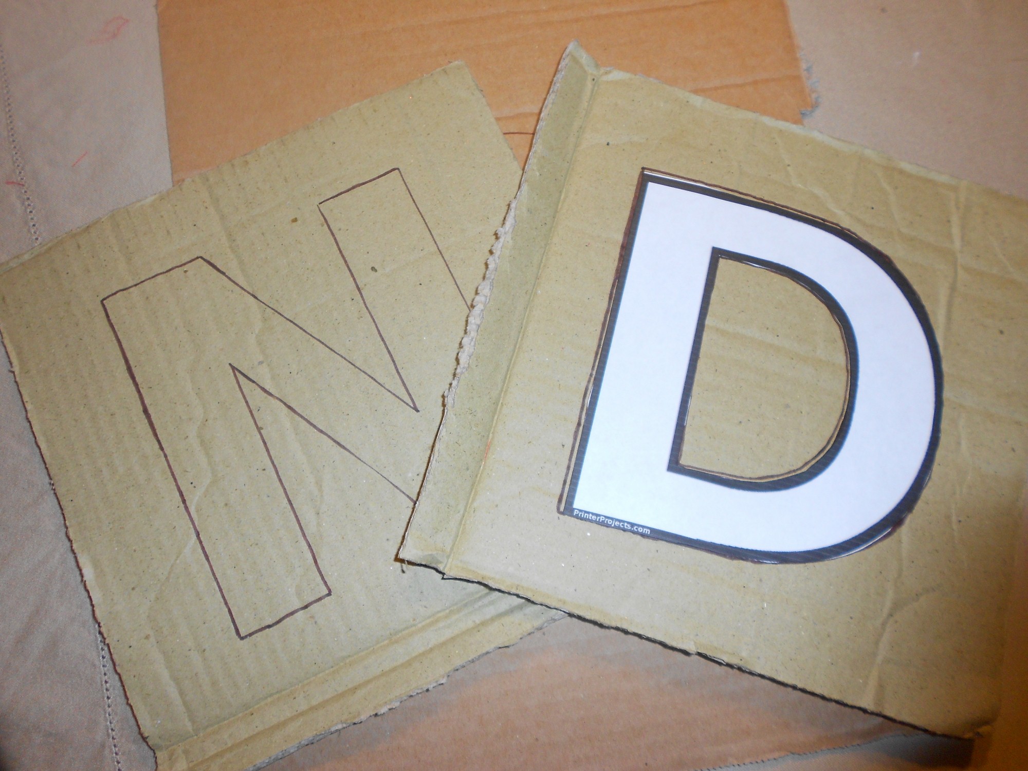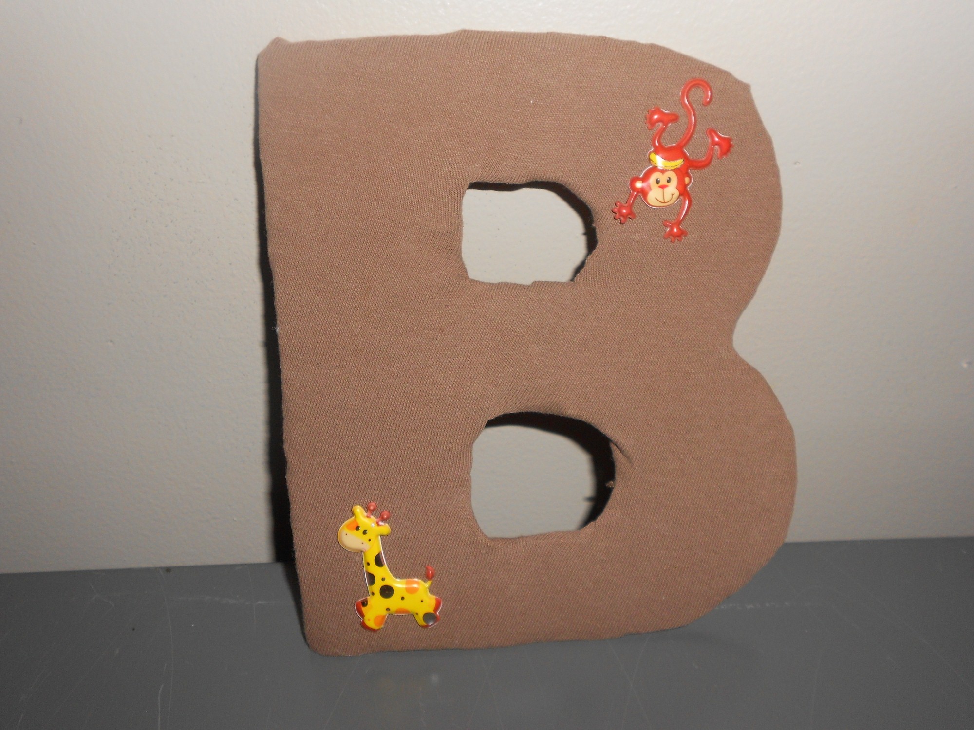 A few days ago, I started thinking about doing an inexpensive project for my son’s room. I came to the decision to do a project with letters. I found printable cut out letter templates at http://www.yourprintablepdf.com/. I cut pieces of a cardbaord box to use for my letters, and I found three old t-shirts that no one in the house wore anymore to use as the fabric for the letters.