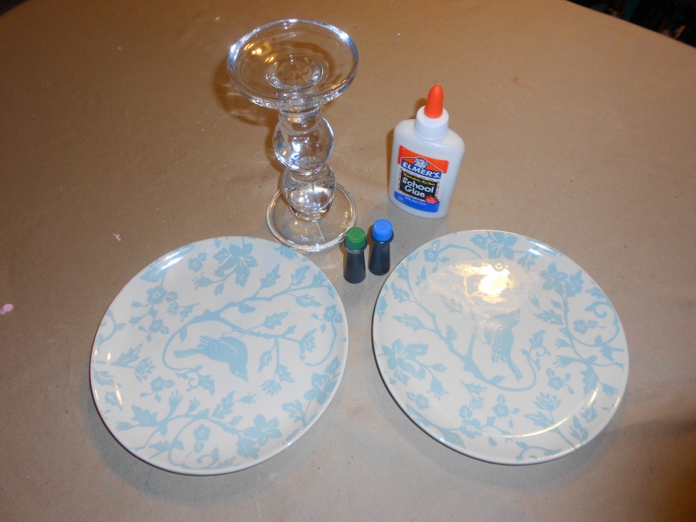 I bought two plates that cost $1.50 each, $1.00 glue, $0.50 blue and green food coloring, and I used an old candlestick that I had in storage. I mixed a couple of drops of the blue and green food coloring with the glue and painted it onto the candlestick. The food coloring and glue gave the candlestick a stained glass look.