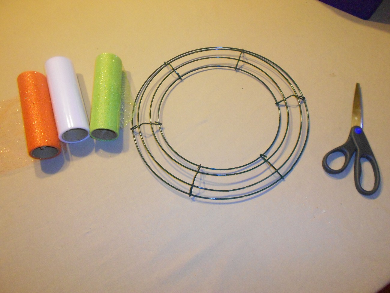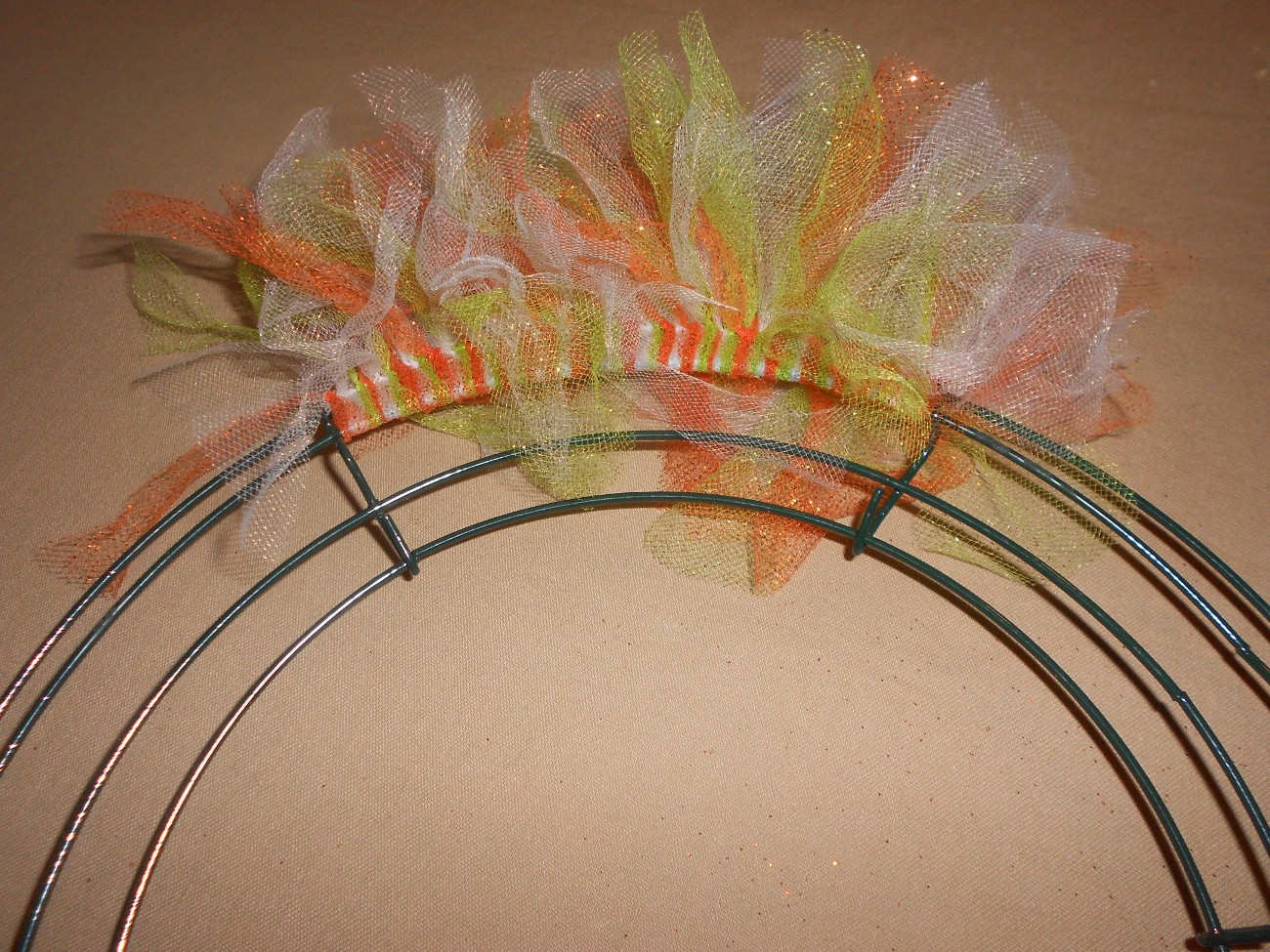 Start cutting the tulle into 6 in. x 1.5 in. strips. You will need several hundred strips to cover the wreath. Next, start tying the tulle into double knots around the top two rings. When you finish covering the top two rings, start tying tulle around the bottom two rings. I like to alternate the tulle in order to have the colors equally distributed around the wreath.