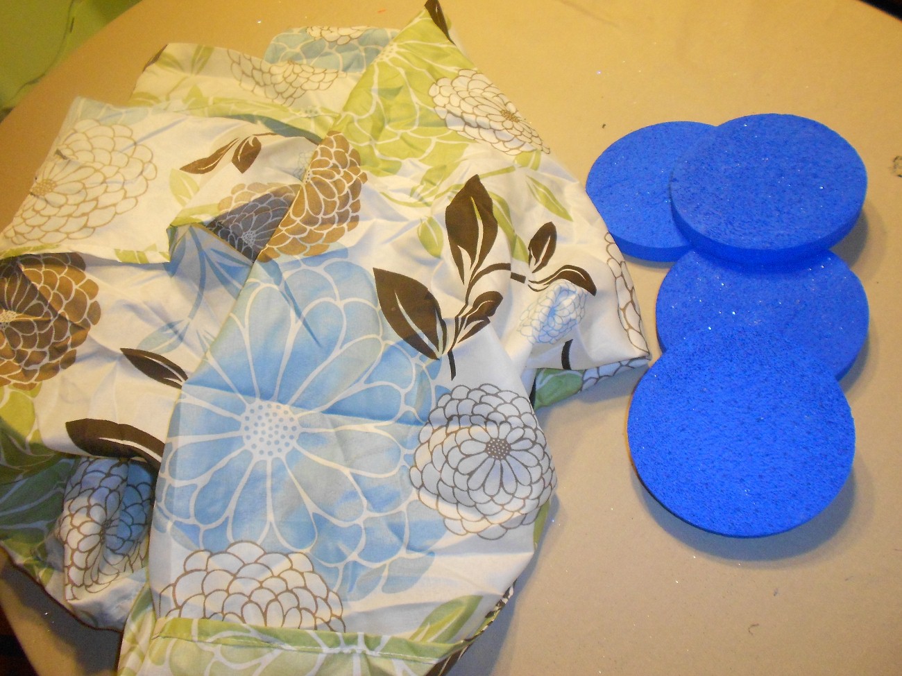 The second project involved using styrofoam circles that I found at Dollar Tree and an old curtain I had in my closet. I cut out pieces of fabric and wrapped them around the styrofoam. You do not have to paint the circles. That was a decision I made at the last minute.