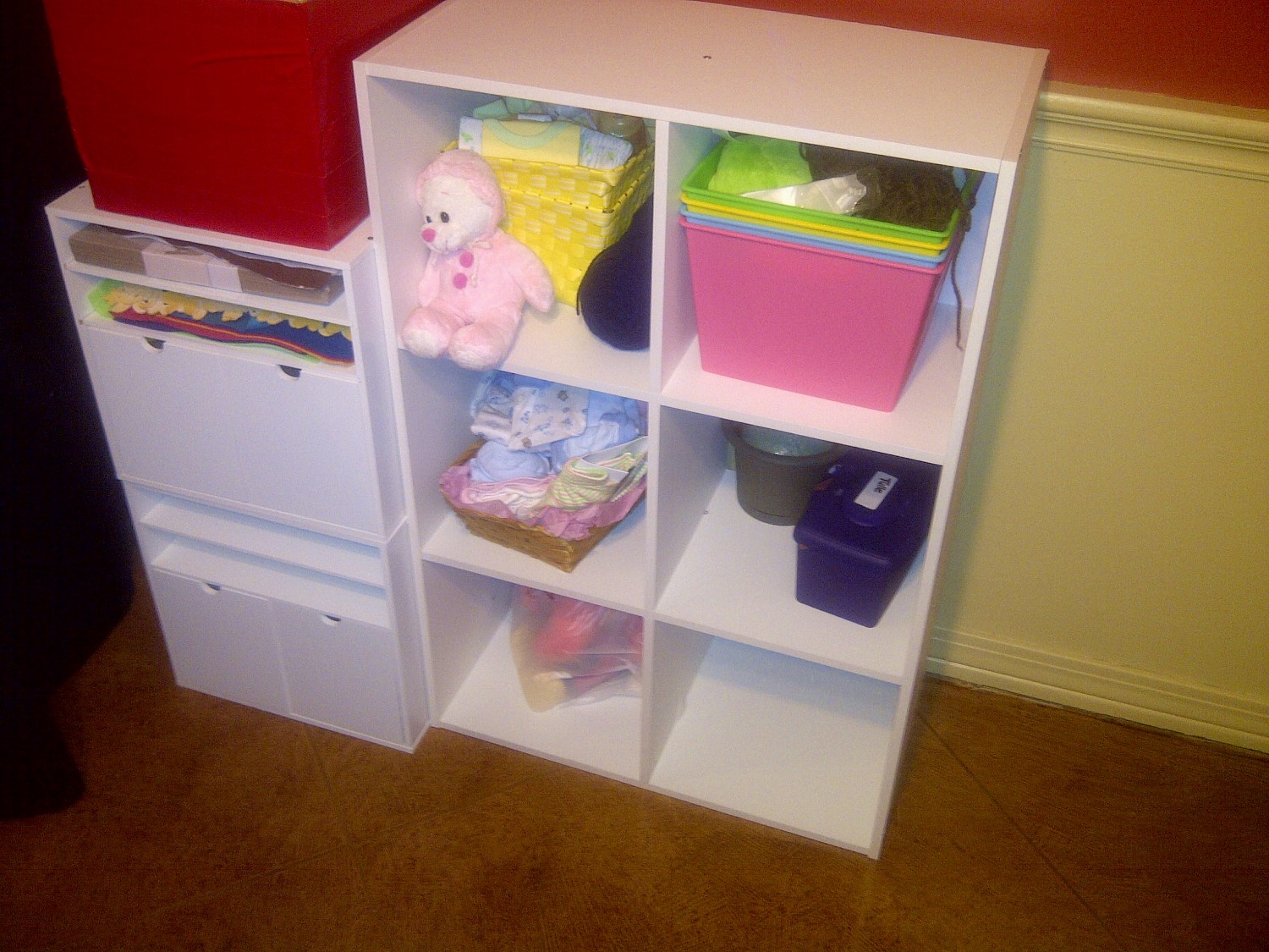 As you can see, I covered the cases with curtains to keep my items out of sight.
