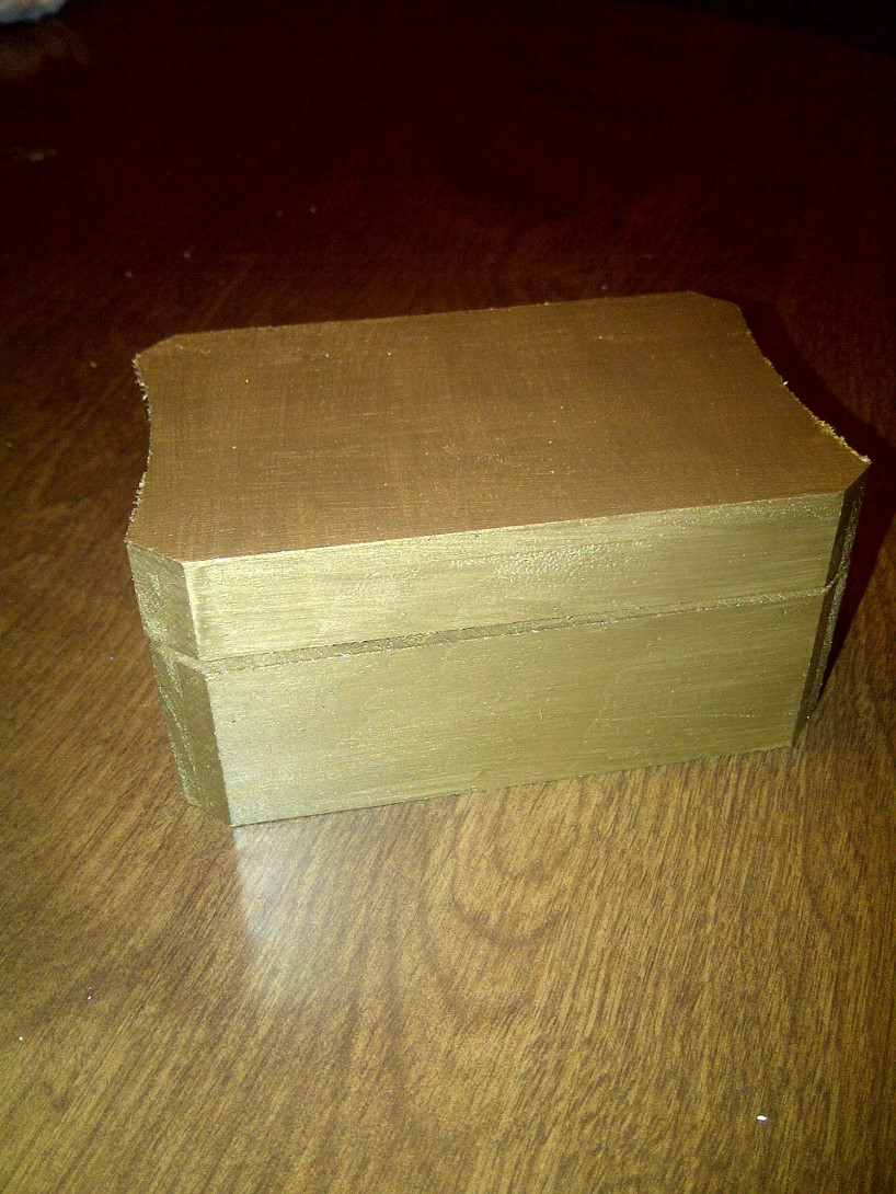 I painted the box with gold acrylic paint so that the wood wouldn’t show through the beads.