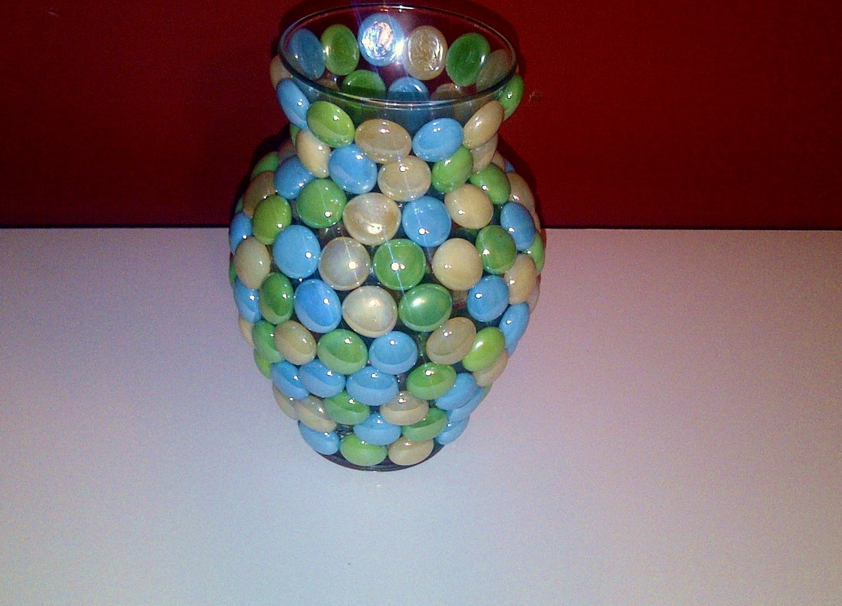 I decided to do this quick and easy project after I bought some bags of glass gems that were on clearance at Michael’s. I bought a $1 vase from Dollar Tree, a tube of Aleene’s Glass and Bead Glue, and I used some acrylic paint I already had at home.