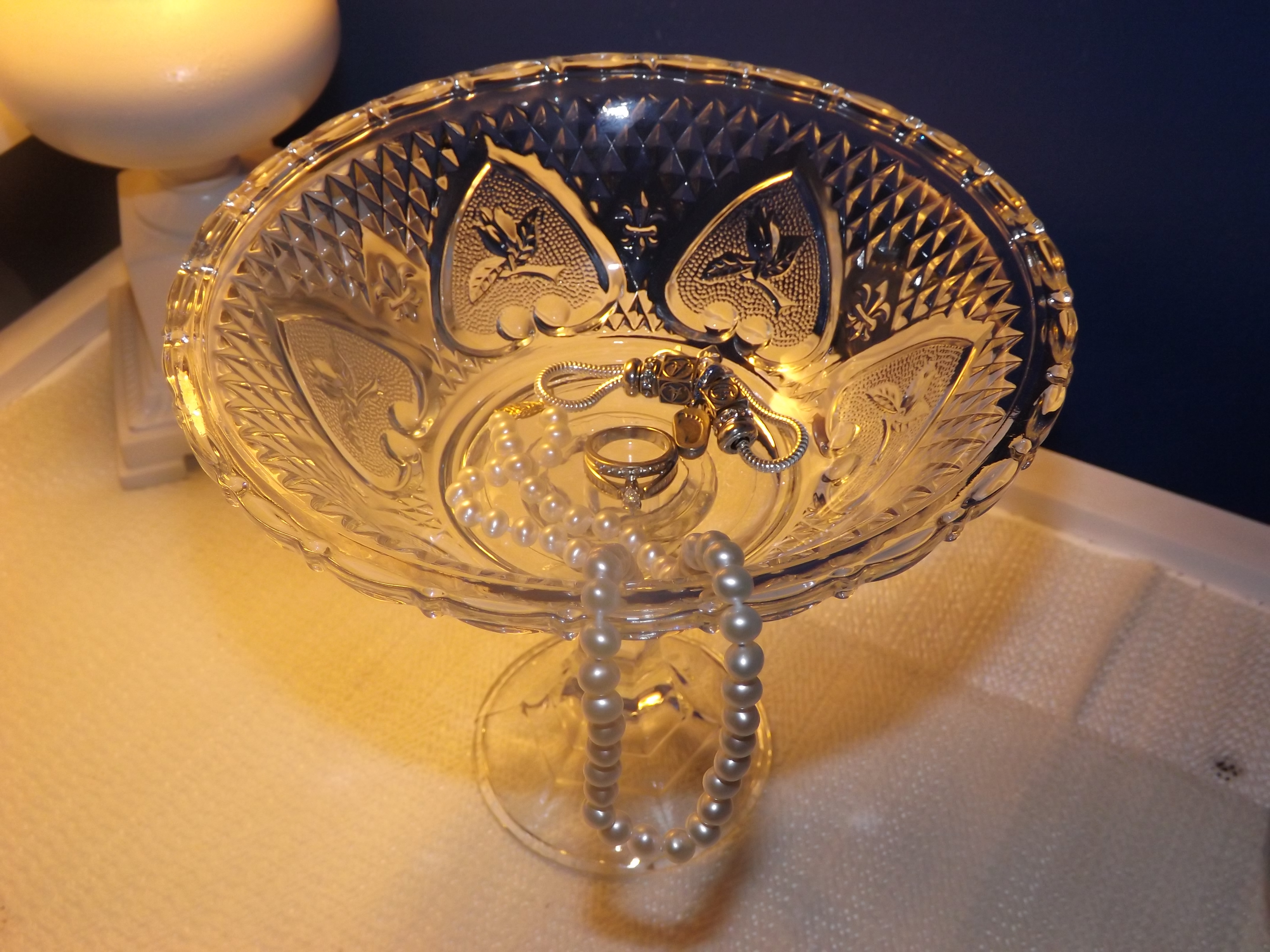 I love to do inexpensive craft projects, and this project only cost me $2! I bought a glass bowl and candle holder from Dollar Tree, and glued them together using a glass and bead adhesive. I decided to use the bowl as a jewelry holder, but it can also be used as a candy bowl, potpourri bowl, or just a bowl to display other decorations.