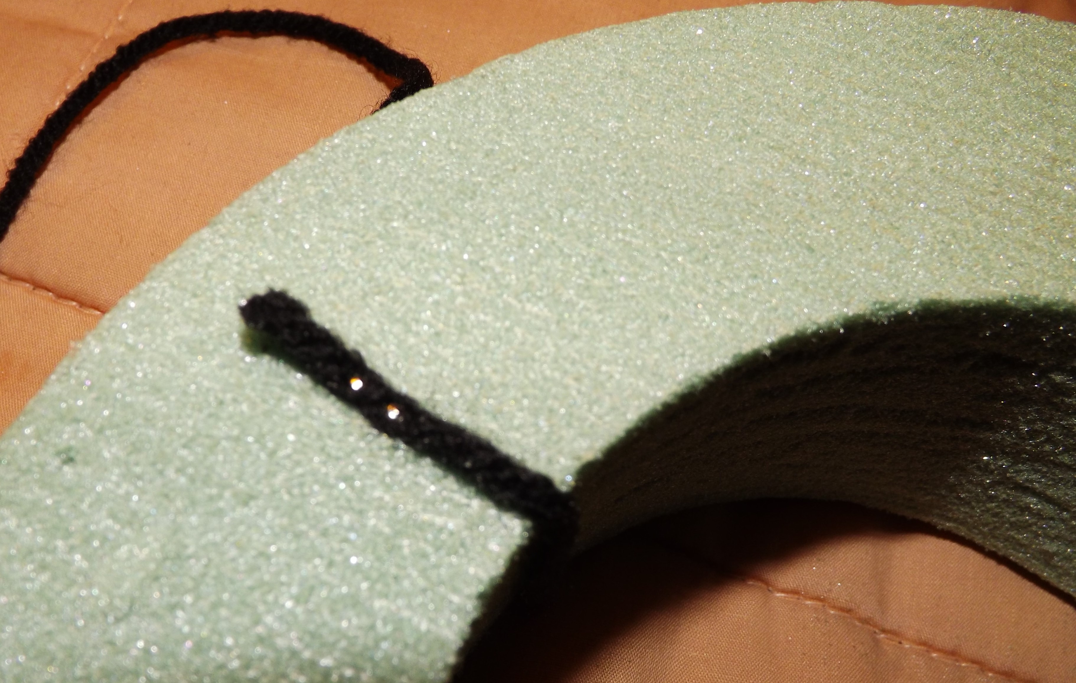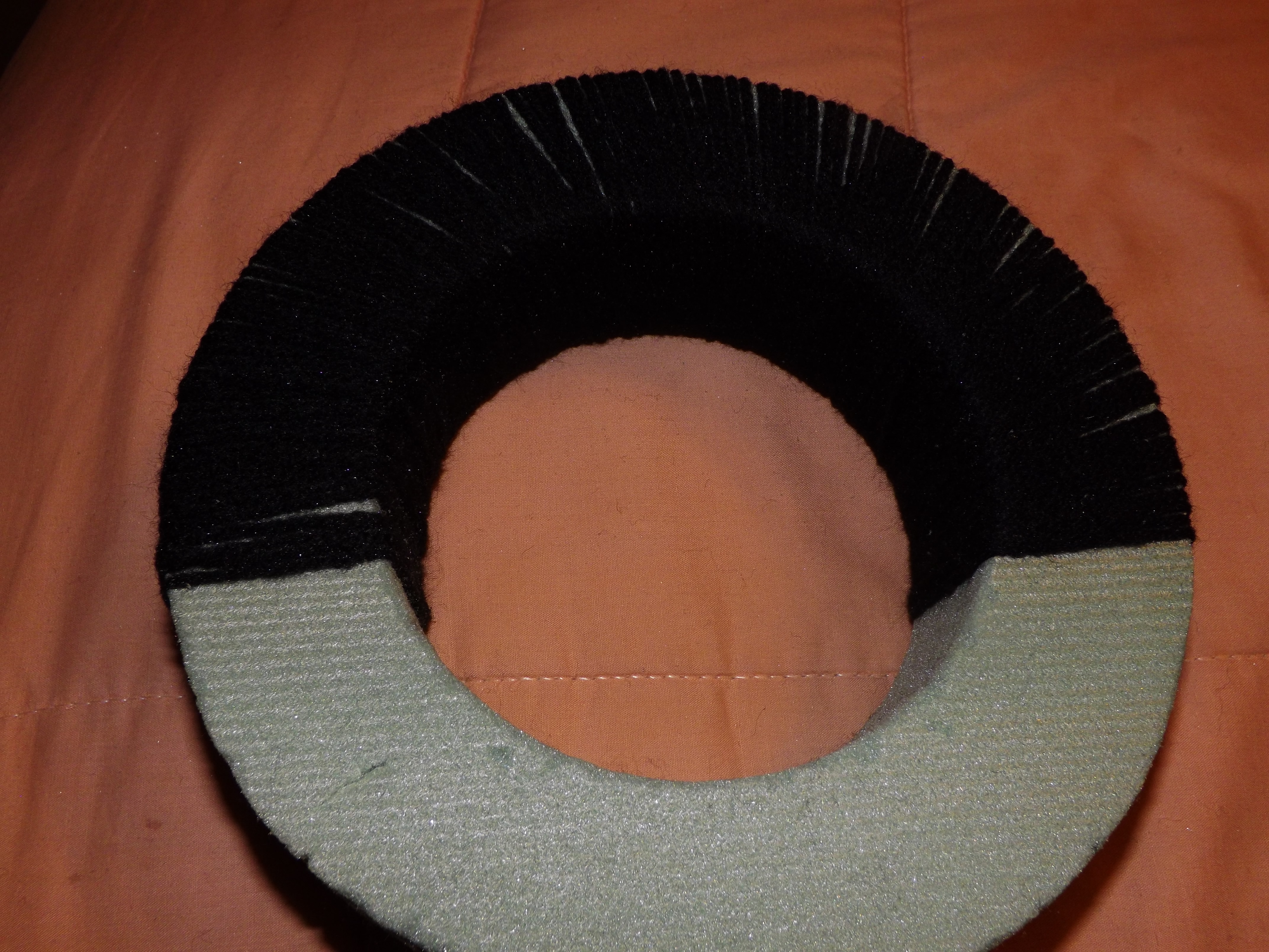 I started off by wrapping the two discs and top half of the ring with black yarn. I used straight pins to keep the yarn in place. Then, I wrapped the red yarn around the bottom half of the ring.