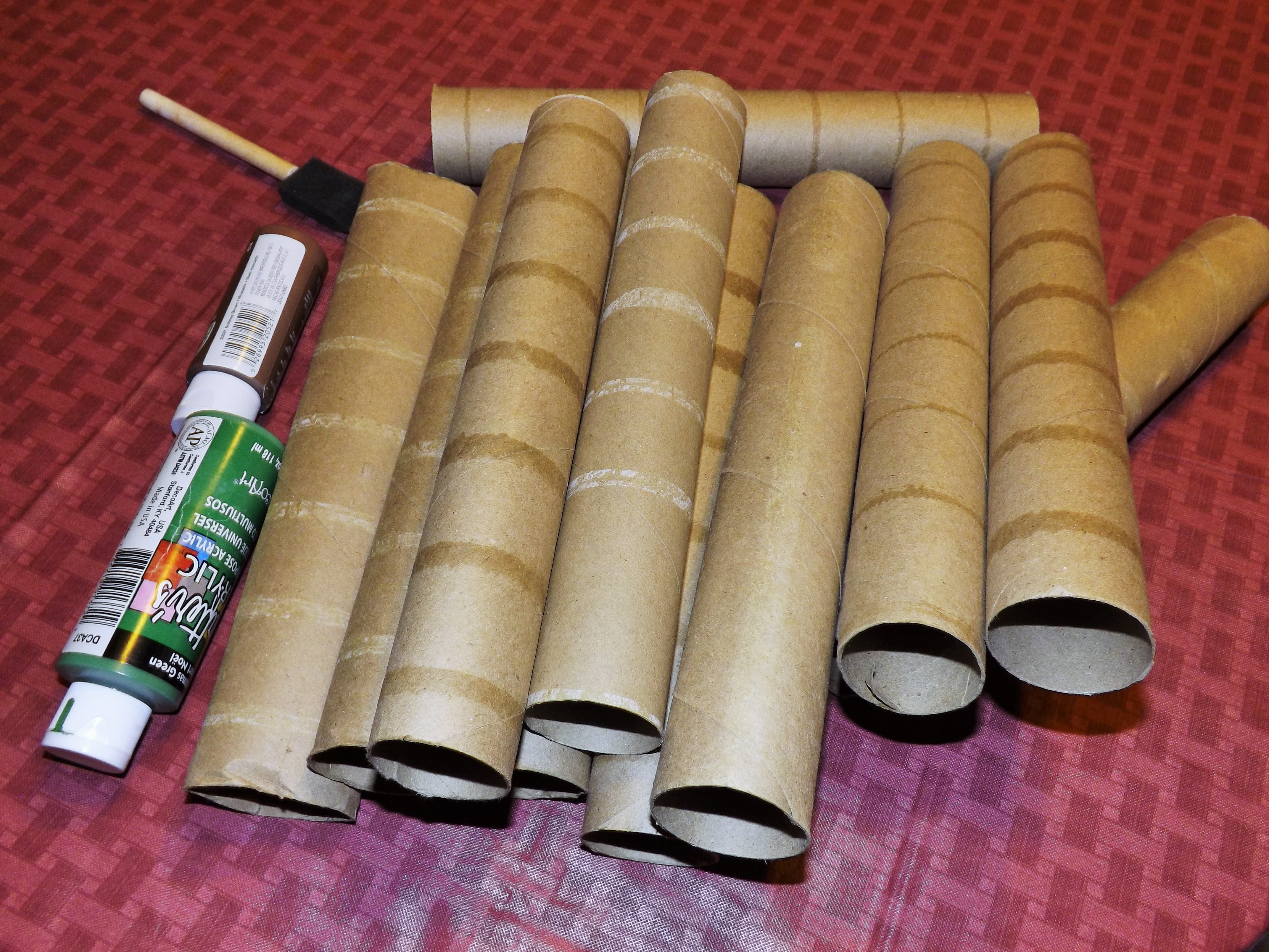 I have saved several paper towel and tissue paper rolls over the past few months to use for future projects. I was so happy to discover the website craftster.org, where a poster gave a step-by-step tutorial (click here) on how to make a tree using the rolls, paint, and glue.