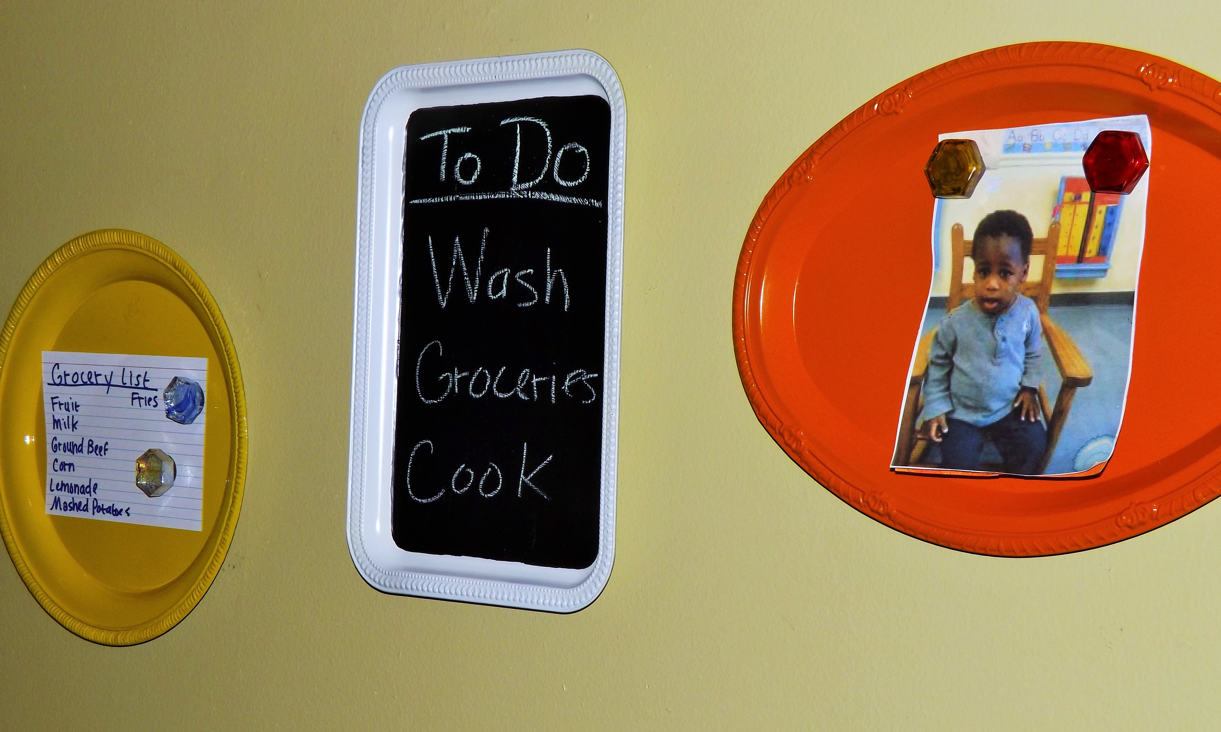 I made magnets for the other trays using adhesive magnet buttons and mosaic tiles.