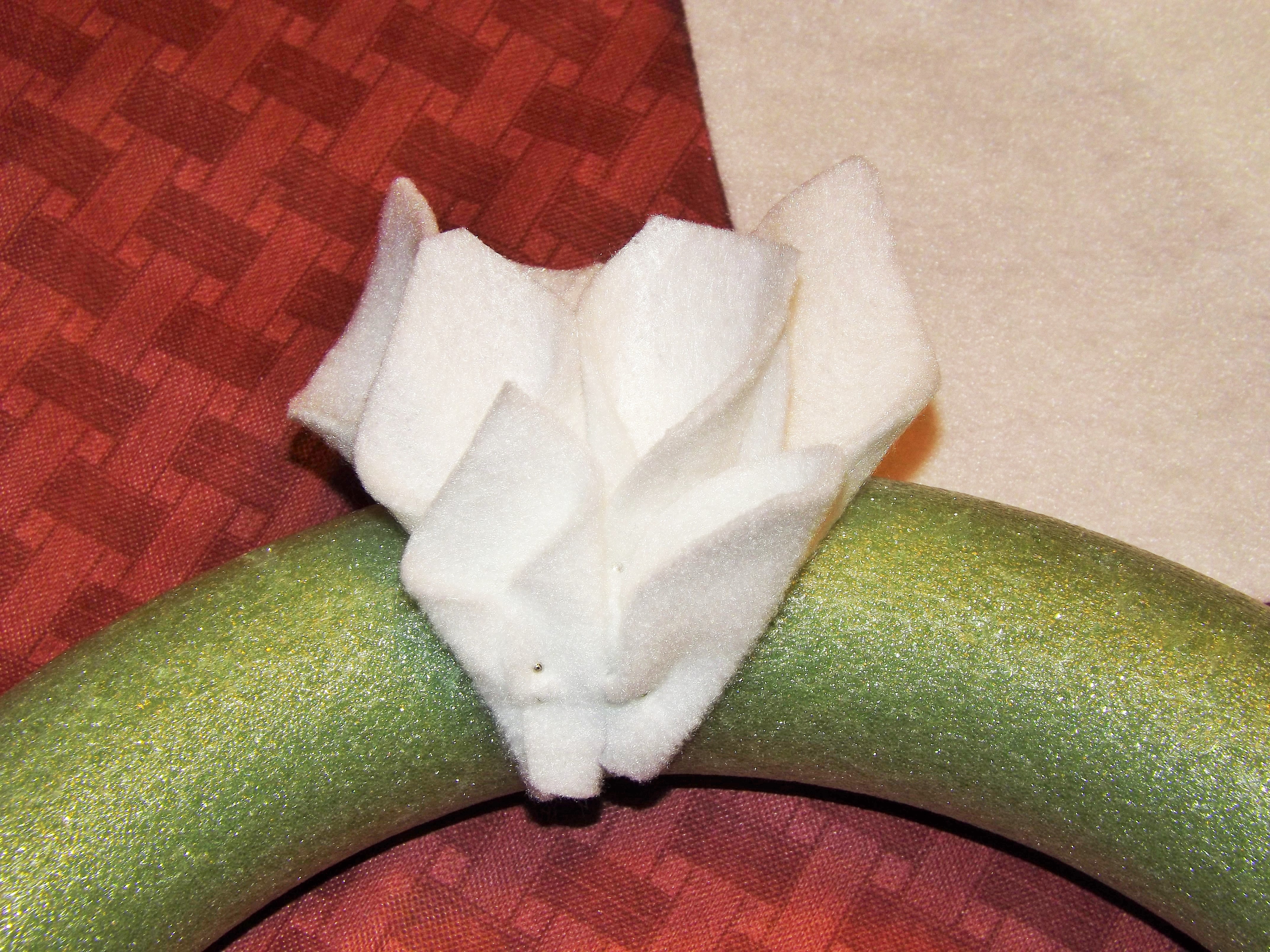 Next, I folded the felt petals into circular shapes and pinned them around the wreath.
