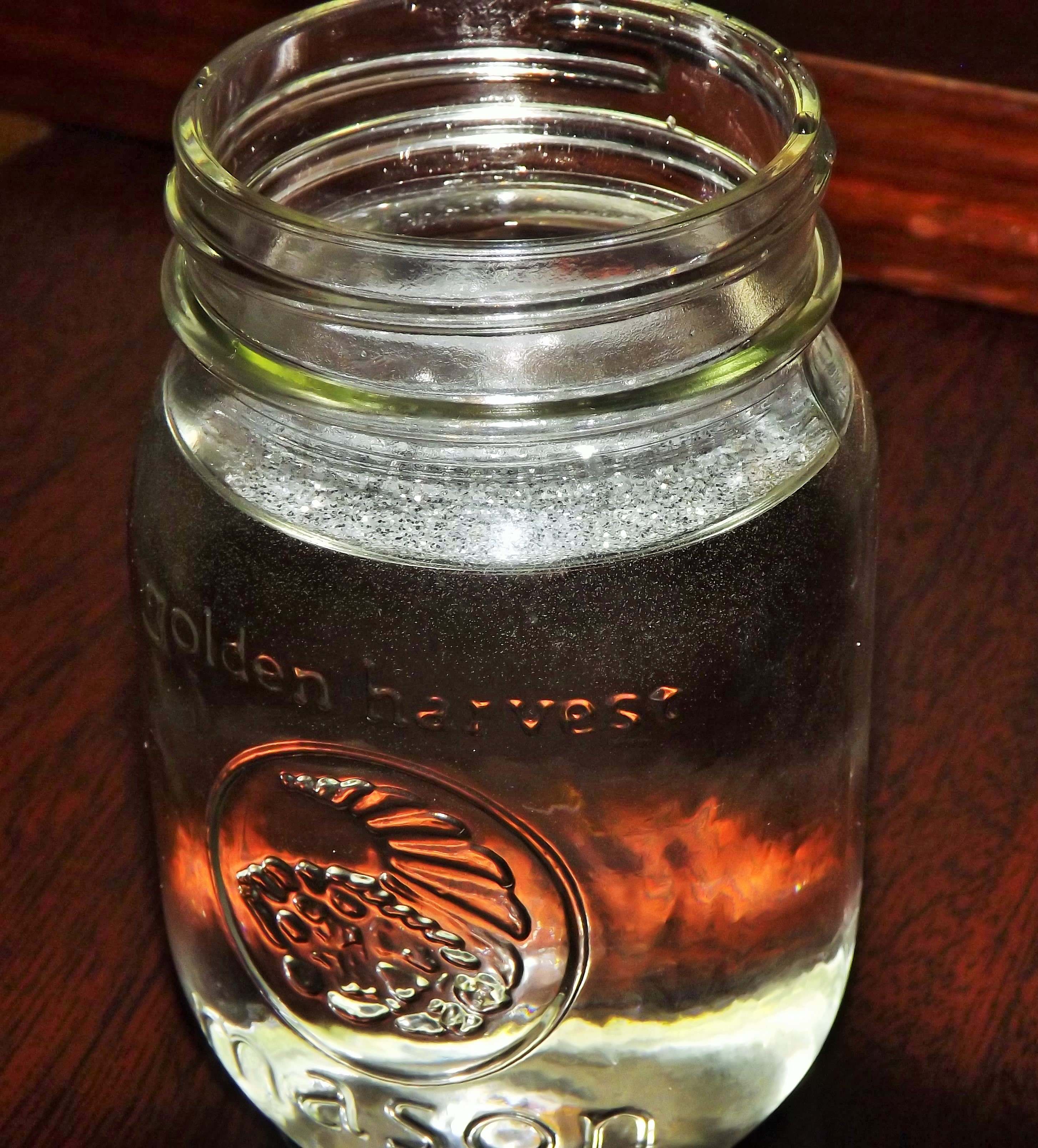 Fill the mason jar almost to the top with water. Then, pour in the glitter. (You can either pour in the glitter first or the water, it’s just personal preference.)