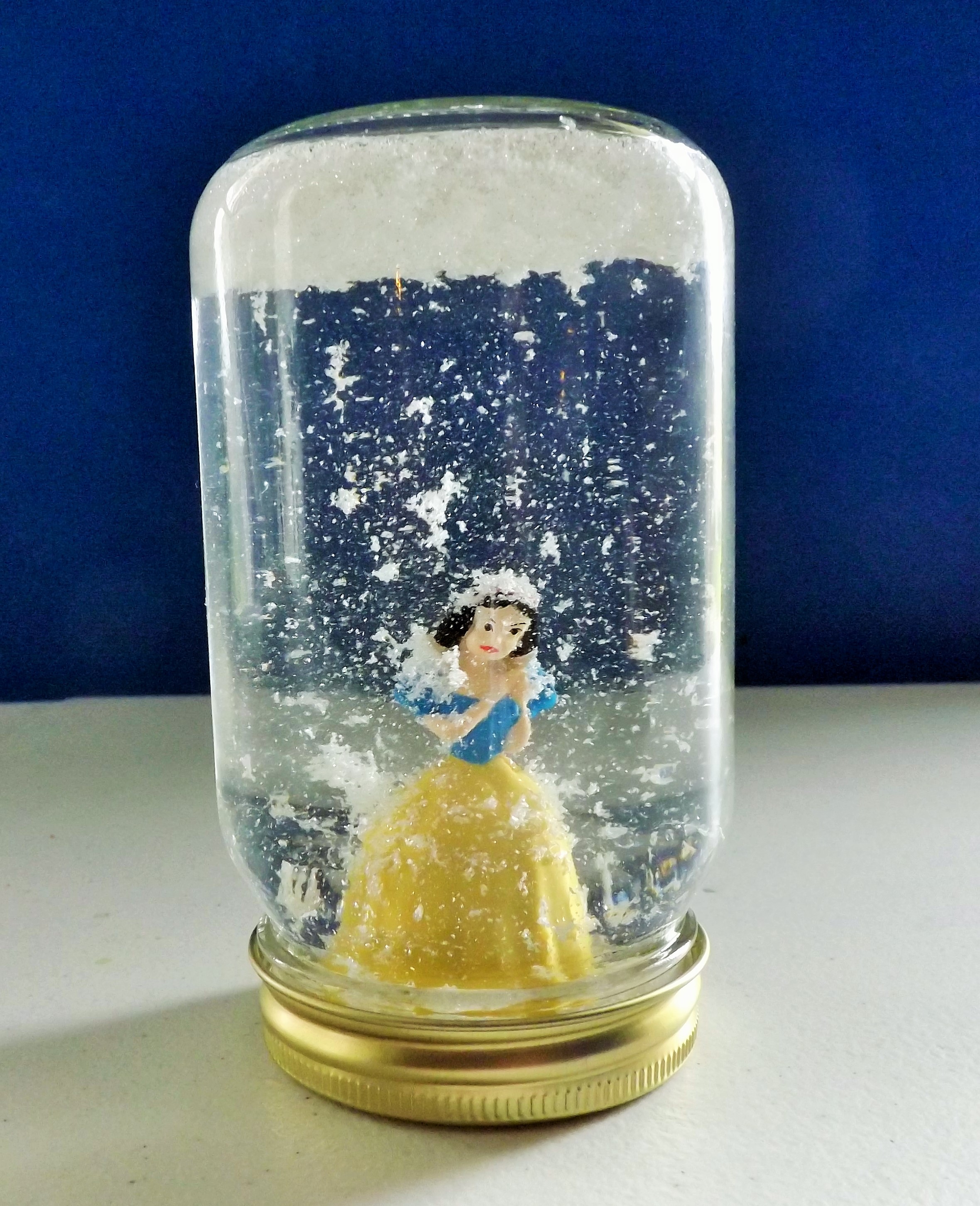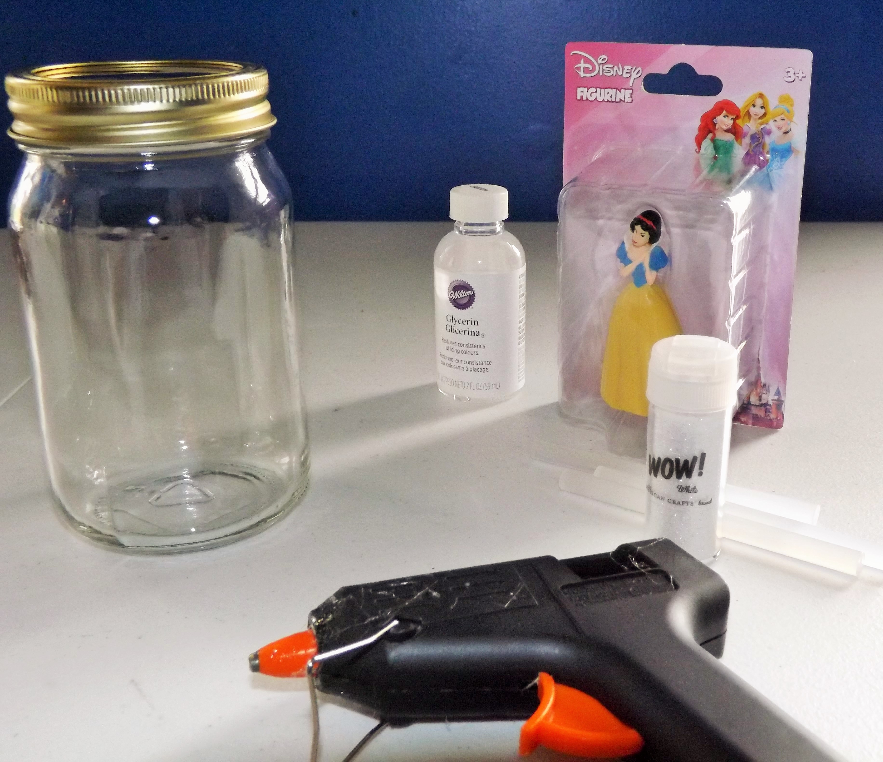 I made a snow globe with a Snow White figurine, canning jar, glue gun, white glitter, and glycerin.