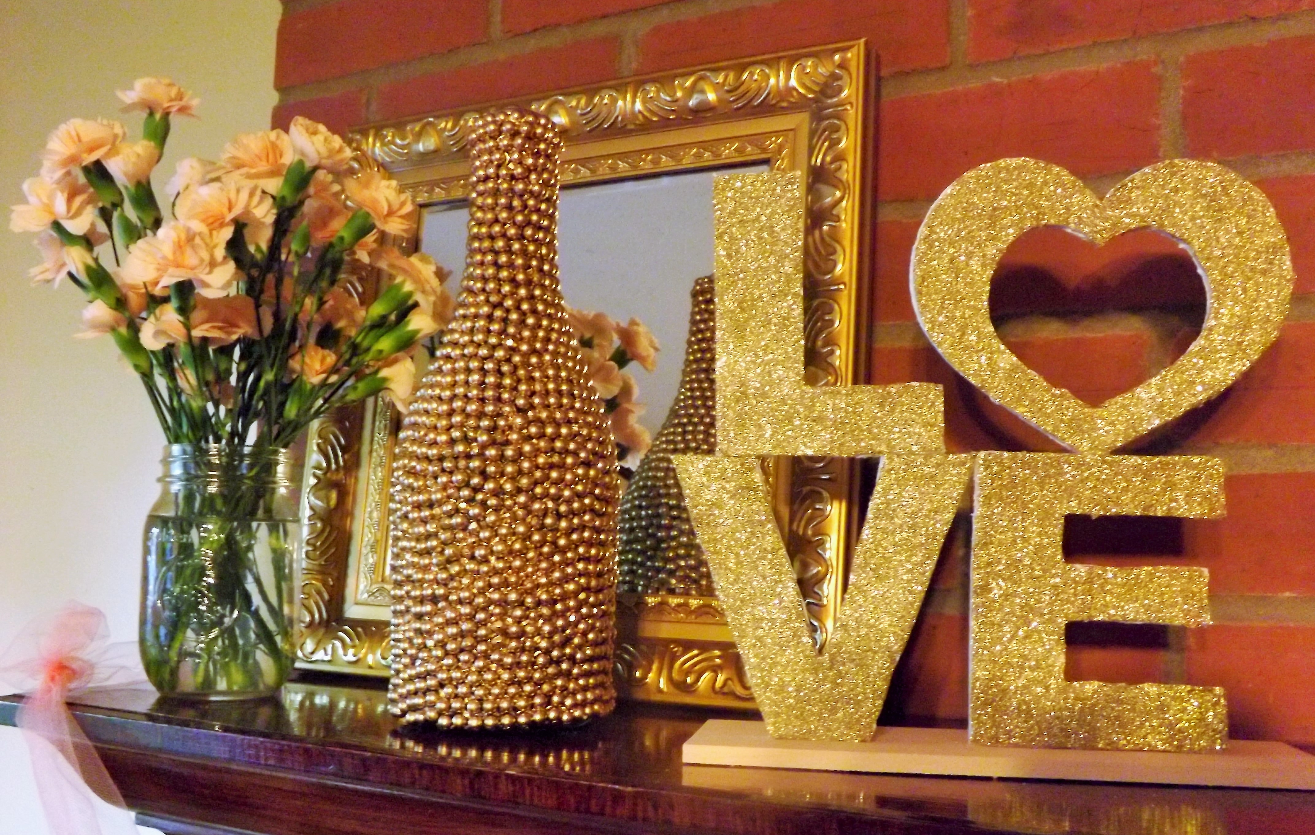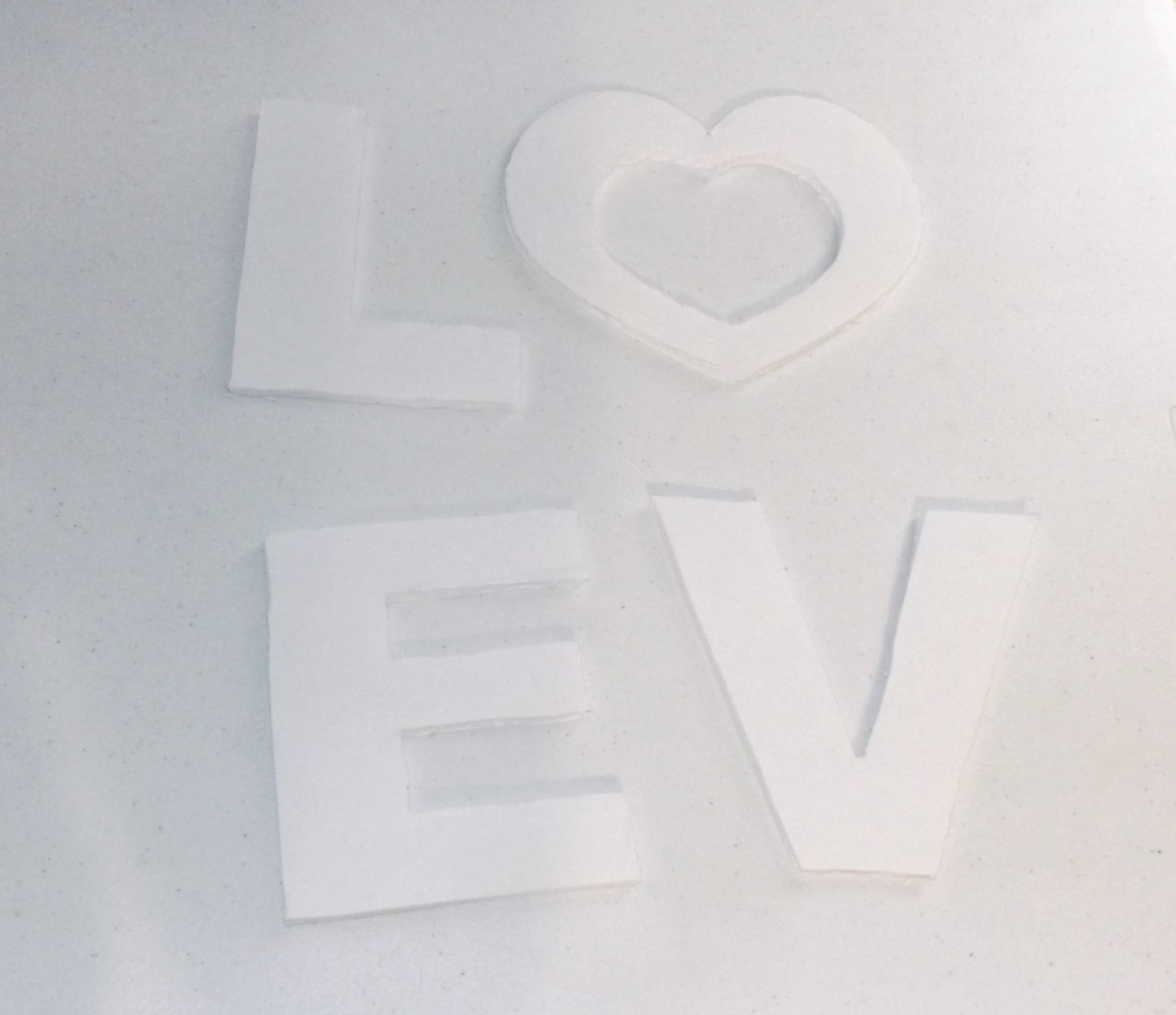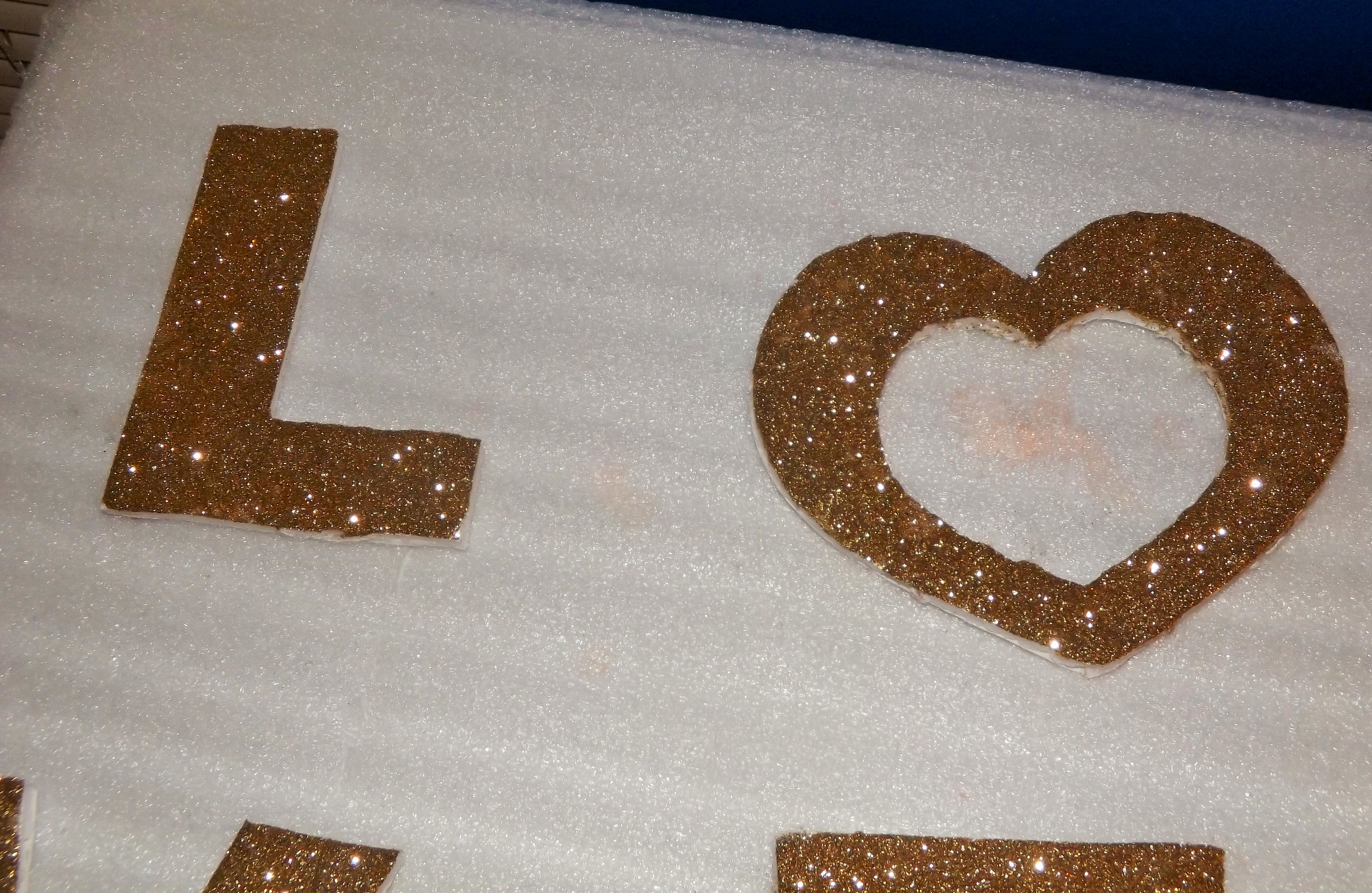 The first project is something I like to call a mini “LOVE” statue. I made it out of a foam poster board and glitter. Then I glued the letters on a painted wood board.