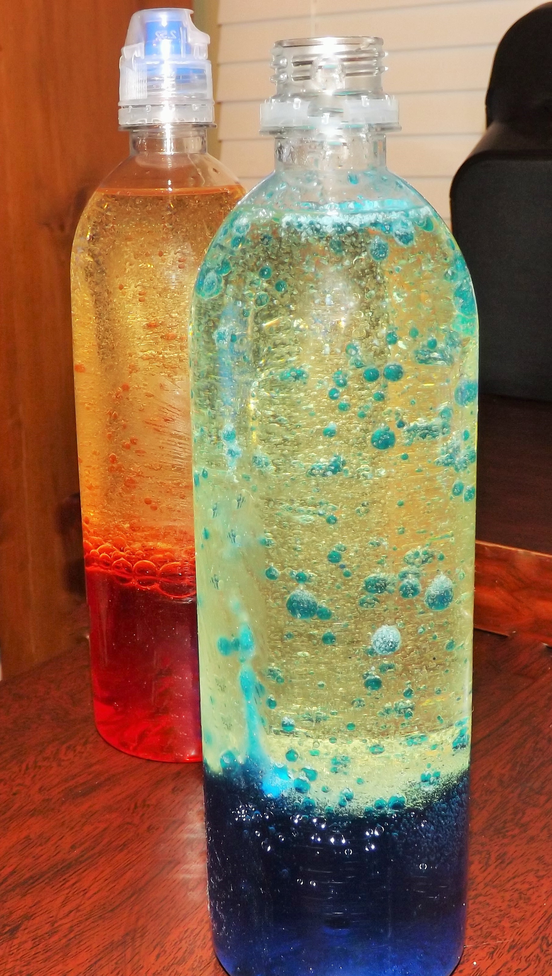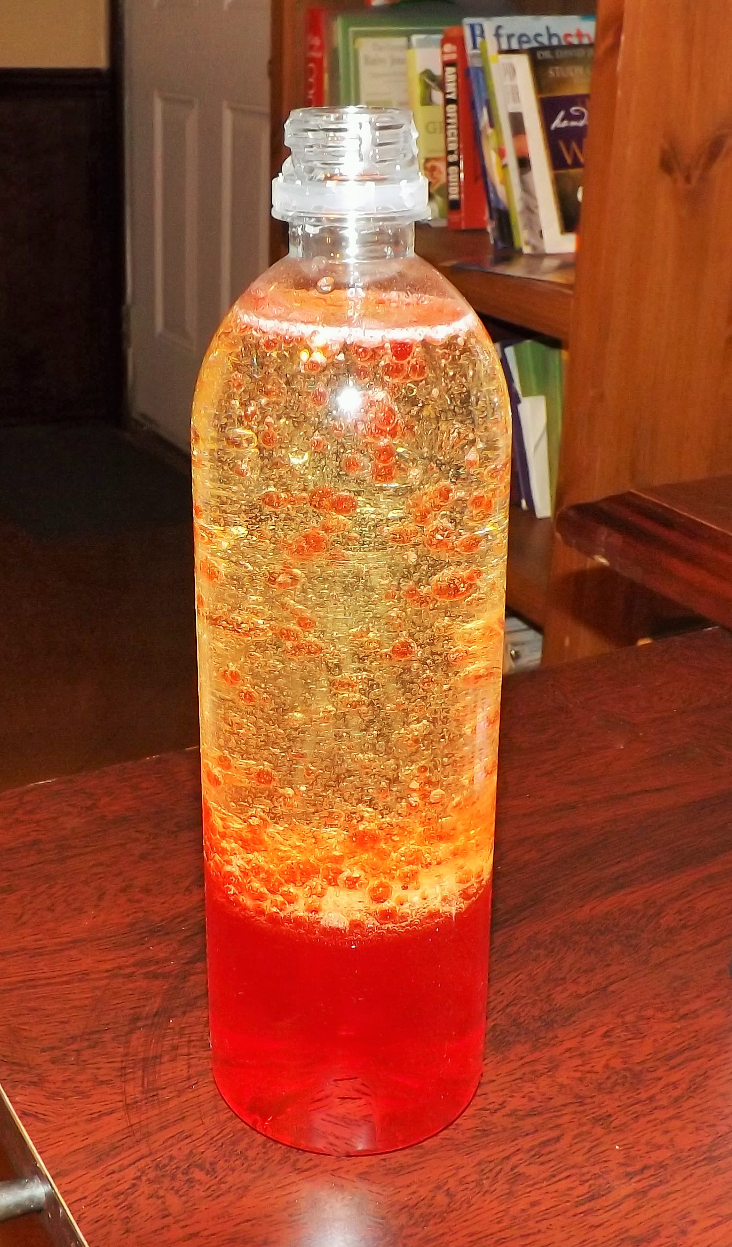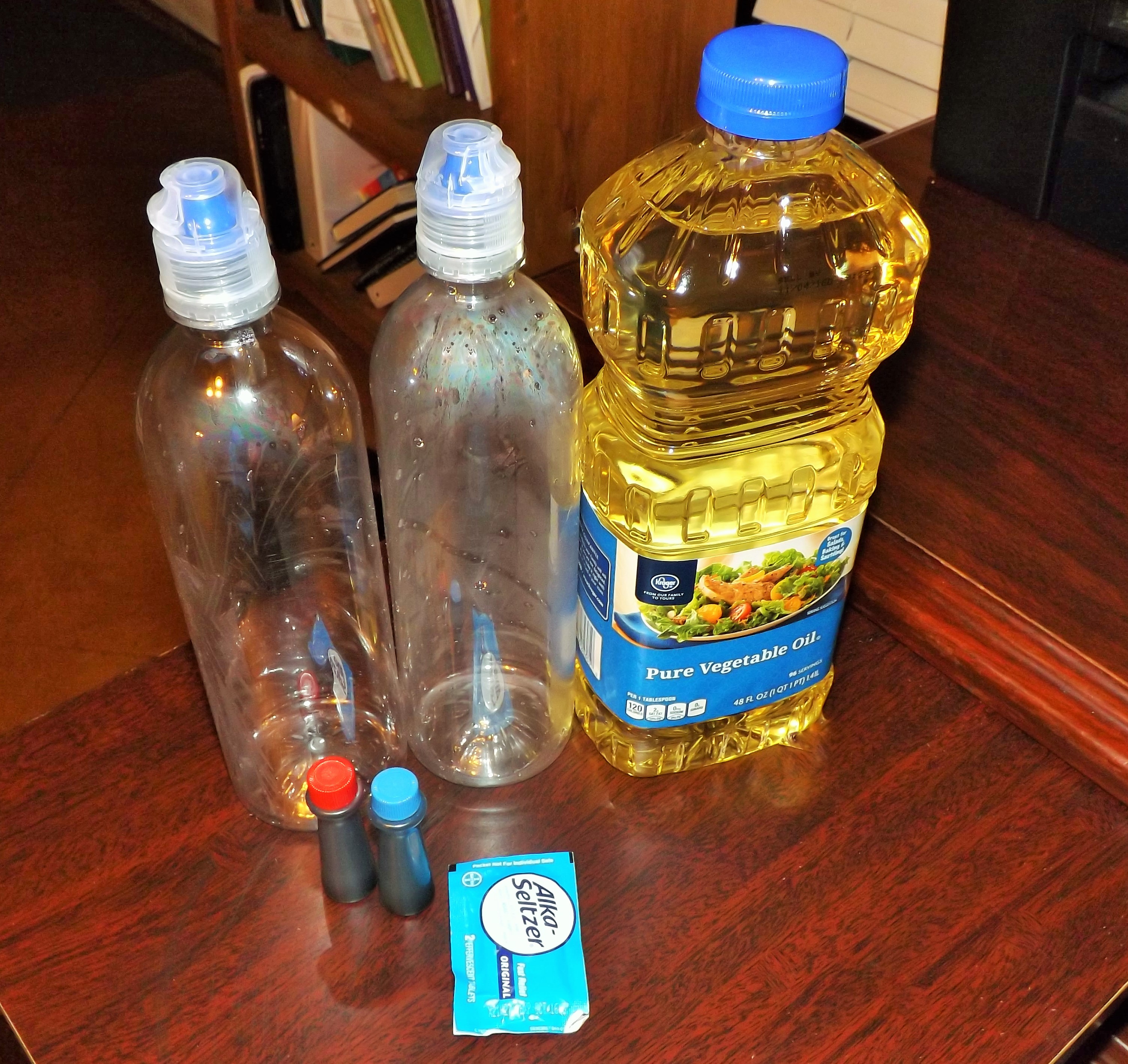 The second project is my version of DIY Lava Lamps. This is an awesome idea to share with children. I filled each water bottle with 1/3 water and 2/3 vegetable oil. I poured about 8-10 drops of food coloring into each bottle. Then I added Alka Seltzer. The Alka Seltzer combines with the oil, water, and food coloring to create the lava effect.