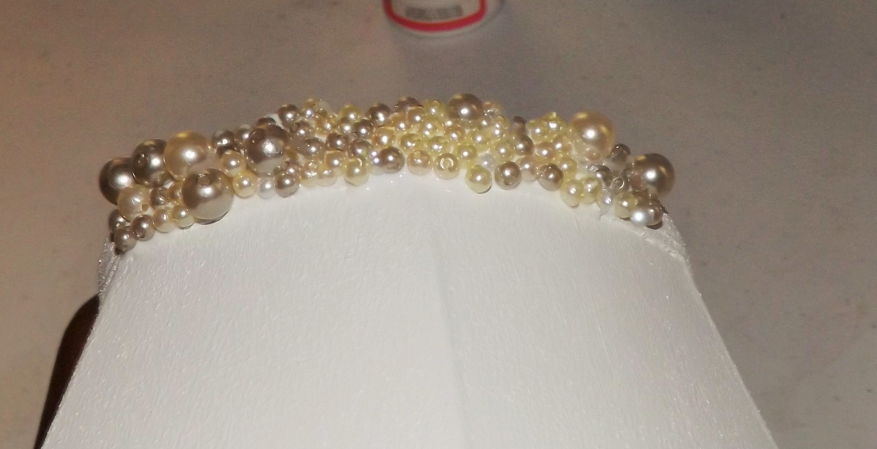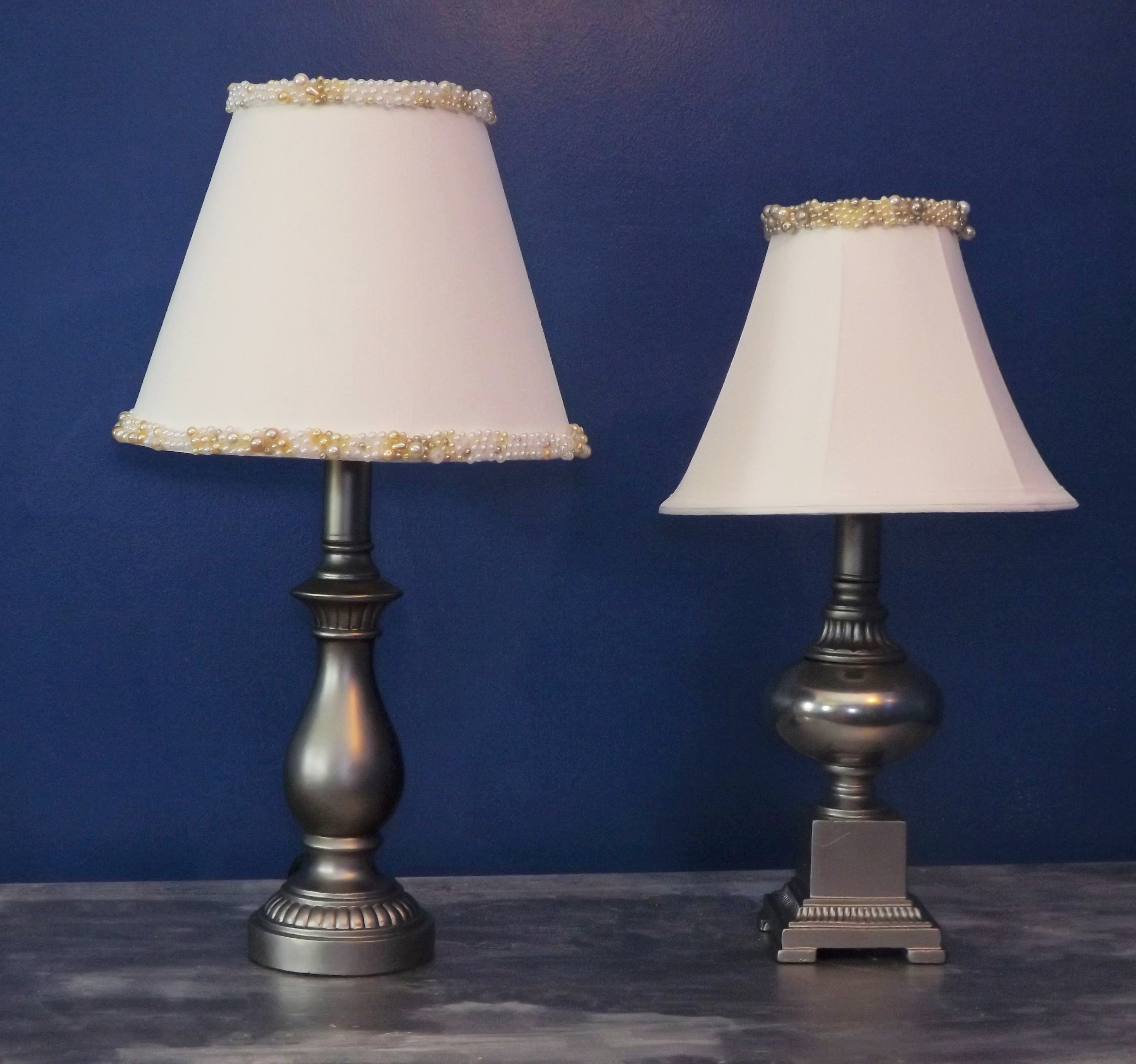 After the paint dried, I began adding pearl beads to the lampshades using Tacky Glue.