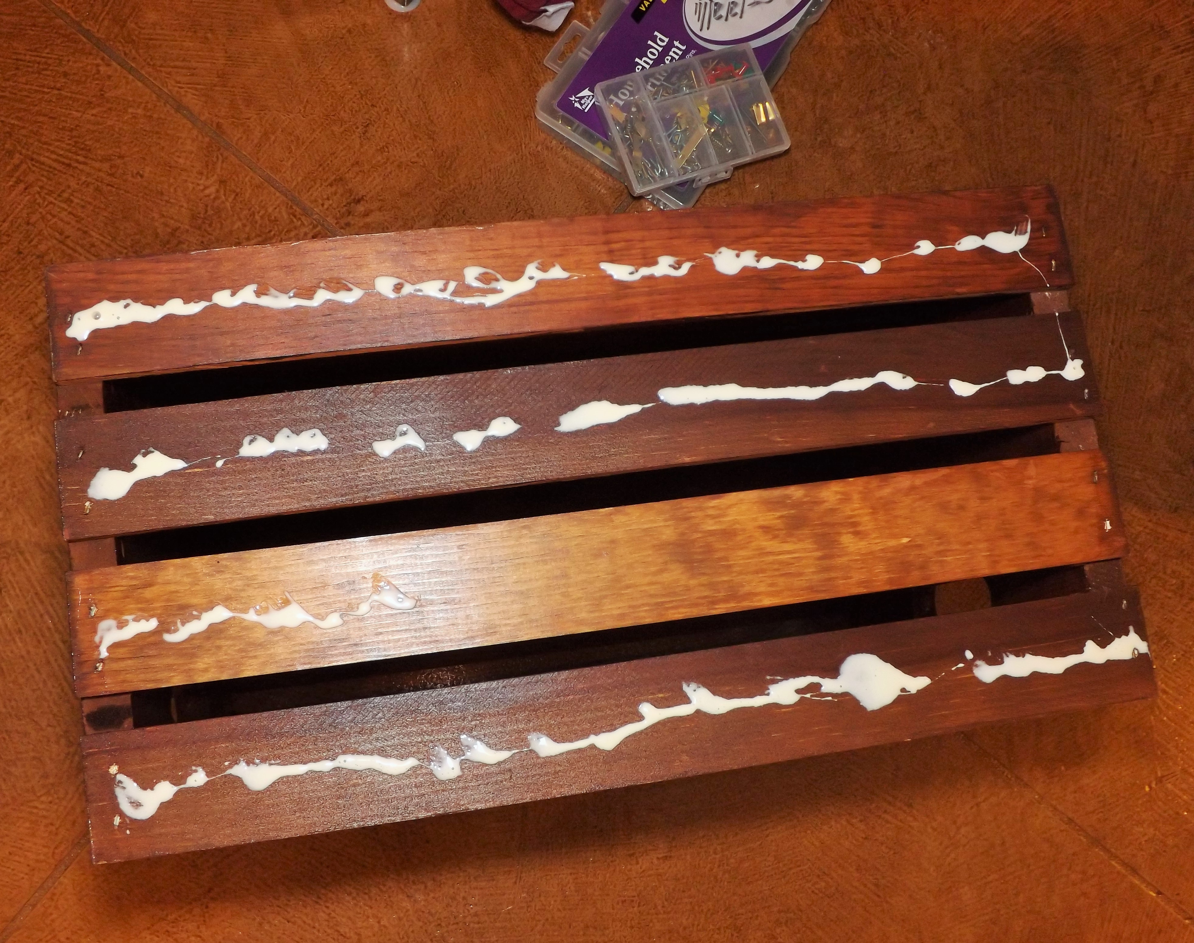I made sure to cover my work area and put on some plastic gloves because the stain mixture is wet and messy. Then, I rubbed two coats of the stain on the wood crates (let it dry about 2 hours between each coat).