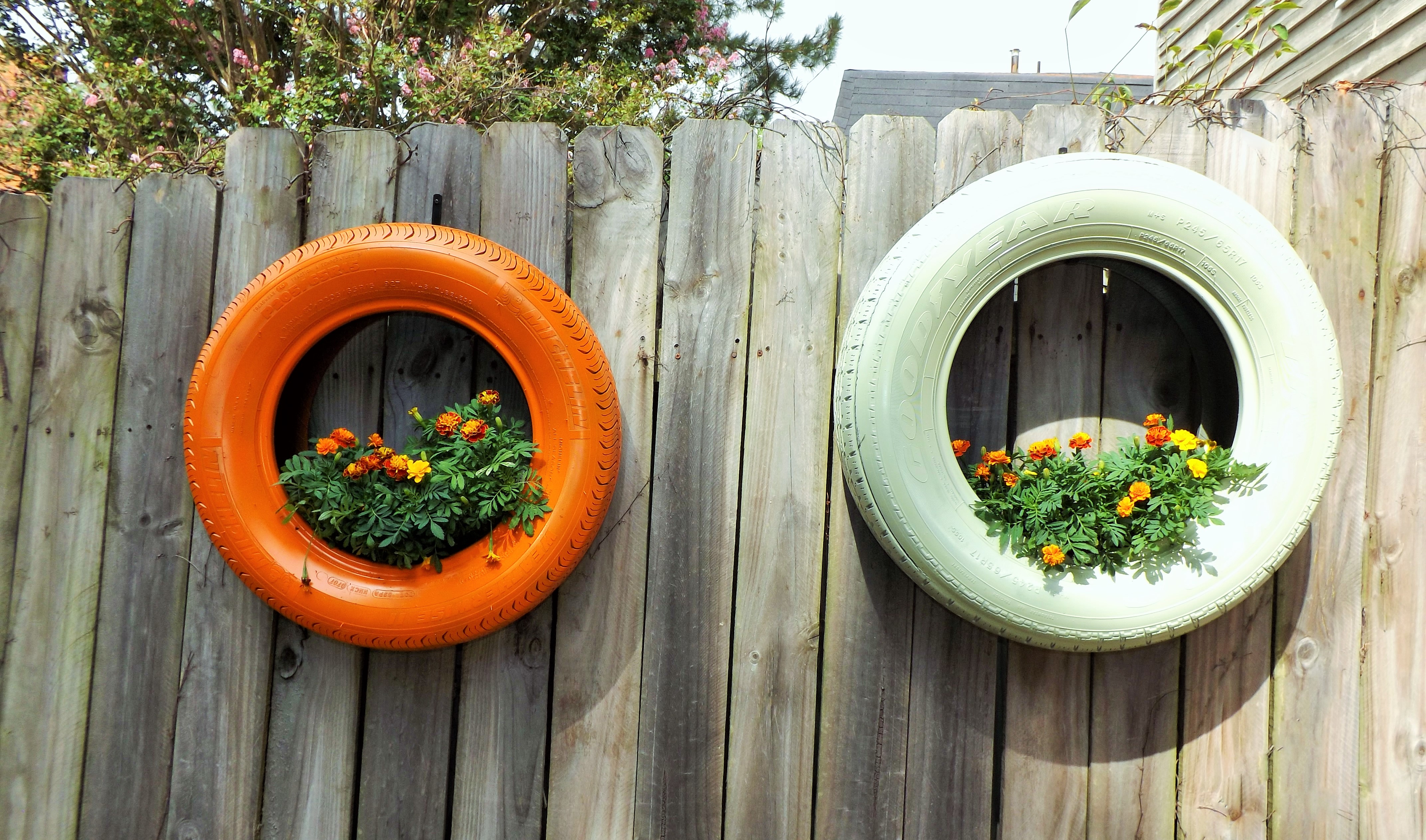 Next, I drilled two metal hooks into my fence and the hung tires. (You can also drill a couple of holes into the bottom of the tires for drainage.)