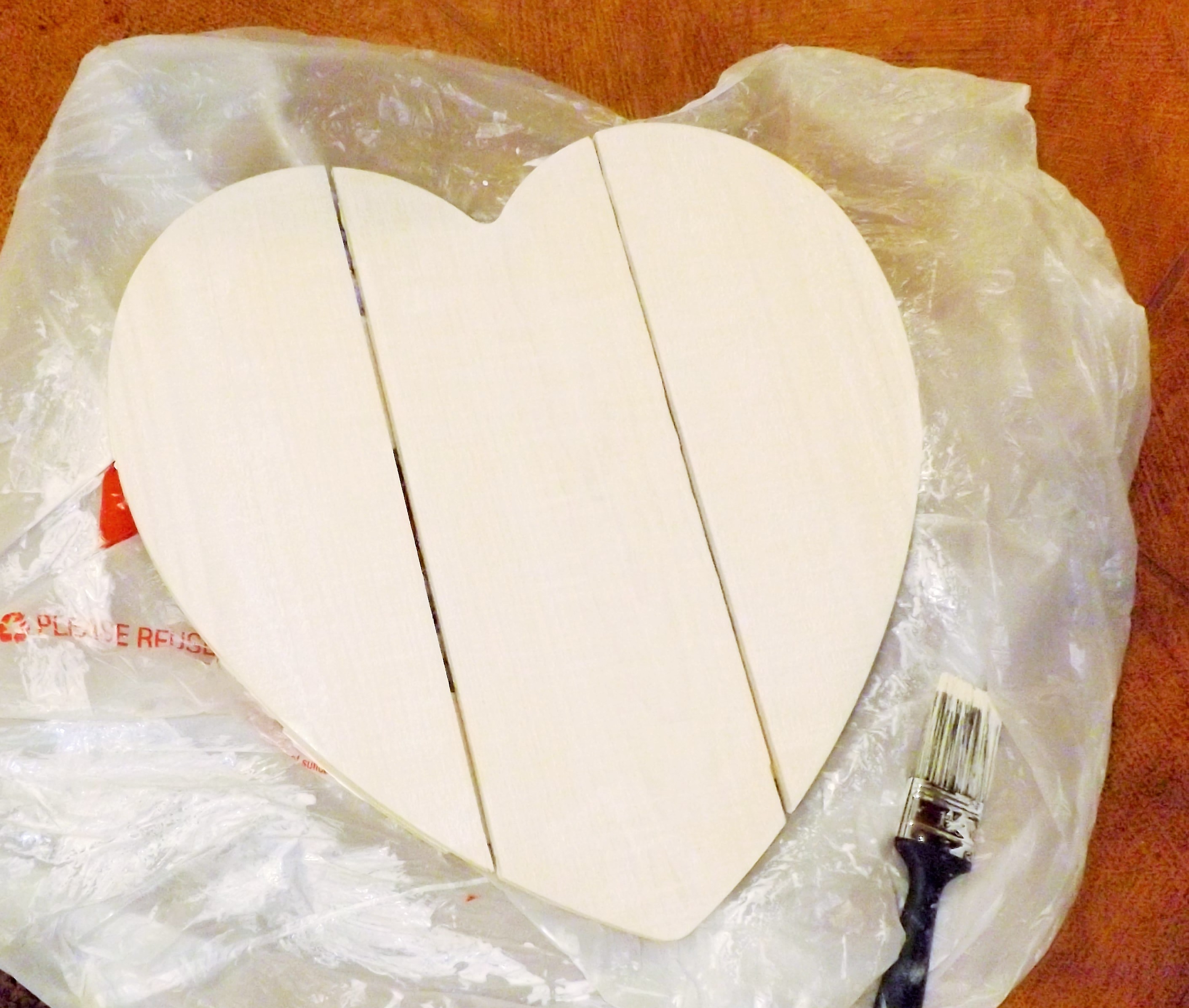 I began by sanding the heart with fine grit sandpaper. There were a few rough spots and splinters that needed removing. Next, I wiped off the wood dust and began painting the heart with the wood tint. This was my first time using wood tint. I saw it was on sale for under $4, so I decided to give it a try. It’s like a watered-down version of paint. It goes on very light and thin and lets you see more of the wood grain. The tint is kind of expensive without being on sale or using a coupon, so if you want to save money and use an alternative, I would suggest adding water to some acrylic paint. I feel this method will bring a similar result as the wood tint.
