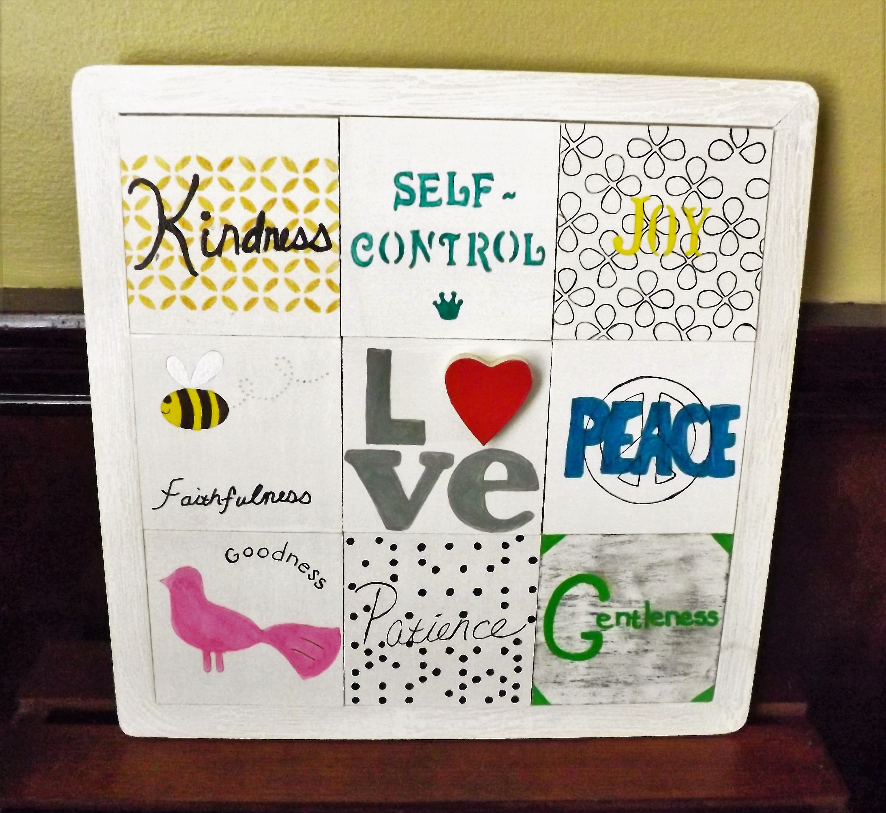 I am a lover of positive quotes and affirmations. I have a scrapbook full of scriptures and quotes that help keep me encouraged throughout the day. When I saw that the tile board had nine blocks, I knew that it would be perfect for a fruits of the spirit craft project. The fruits of the spirit are: love, joy, peace, patience, kindness, goodness, faithfulness, gentleness, and self-control. I think these are excellent traits to demonstrate everyday.