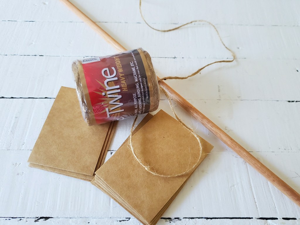 - Thread jute twine through the holes, and then hang the bags on the wood dowel.