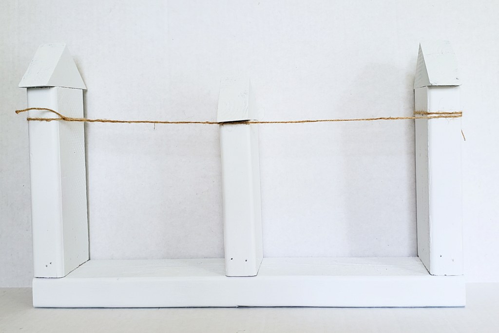 Next, I painted the stand. It needed about 2-3 coats of white spray paint. After the paint dried, I then tied the twine across the top of the stand.