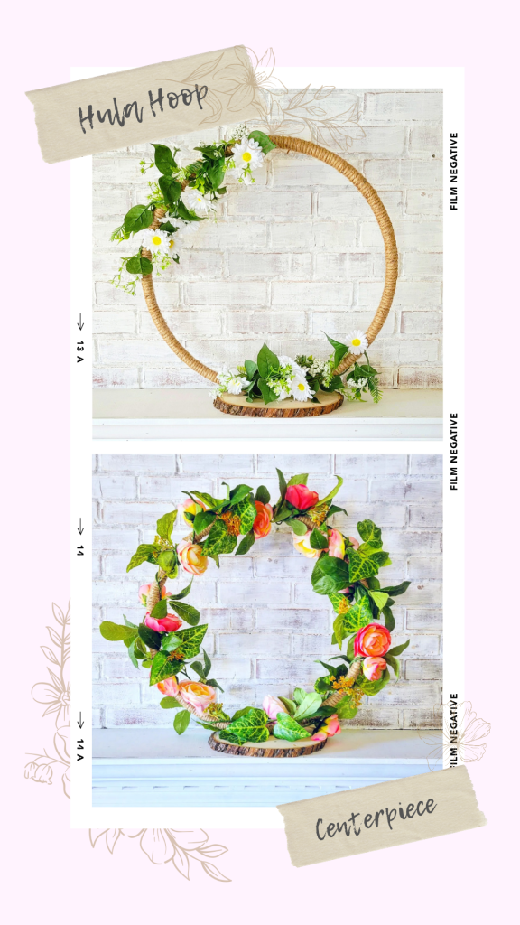 I must admit that I enjoyed making this centerpiece so much that I decided to make another one with different flowers. I love the versatility of this project. I can continue to use the hoop as a base and add other flowers for each new event.