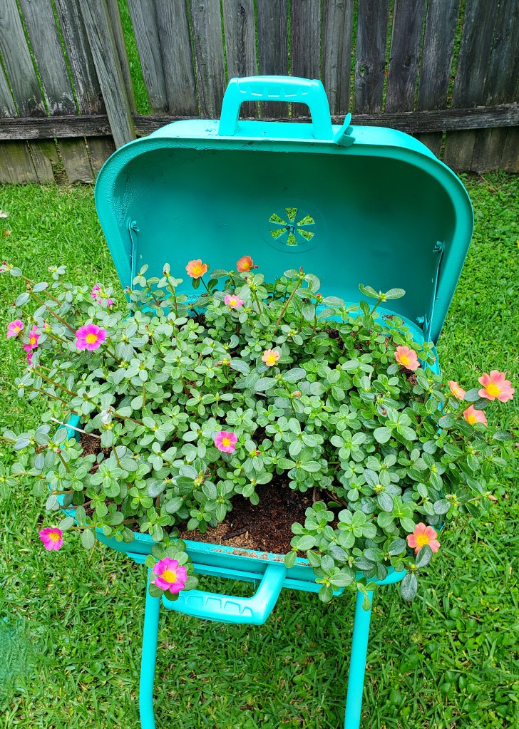 My backyard is small, so I always look for ways to add charm and character. I saw a few photos on Pinterest where people reused everything from tires to toilets and turned them into planters. For my projects, I used an old grill and two tires.
